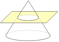 Circunferencia: nace de la intersección de un cono y un plano cuando dicho plano es paralelo al eje horizontal del cono. El radio de la circunferencia dependerá de la altura a la que se realice el corte, dando como resultado desde un solo punto (cuando el corte se realiza en el punto medio del cono) hasta una circunferencia de radio infinito